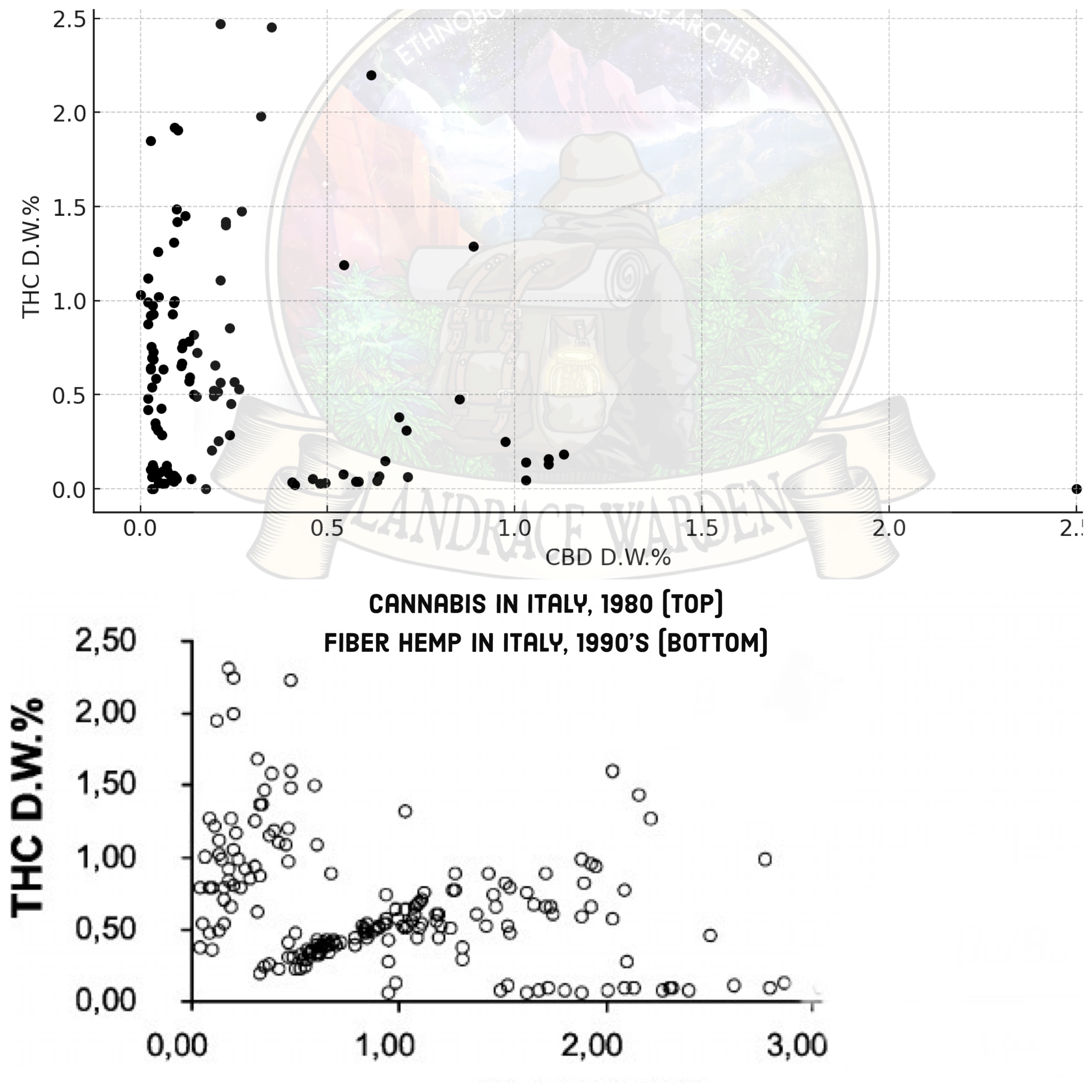The development and applications of molecular markers to hemp breeding are less than 30 years old. In the 1990’s, traditional Italian hemp fibre variety ‘Eletta Campana’ was unable to remain as a hemp variety in the EU at the time due to its THC content, as a few phenos contained more than 2% THC and many were THC dominant. The interesting context is that in the 1979, of 114 seized samples of illegal cannabis in Tuscany Italy, only 3 out of 114 analysed contained more than 2% THC, with the highest concentration of 2.47% recorded. So much of the illegal cannabis being used in Italy in the late 1970’s was of the same potency that could be found naturally in traditional hemp fibre varieties of the region in the 1990’s. 3 out of 10 of the seized samples from 1979 contained less than 0.3% THC.
