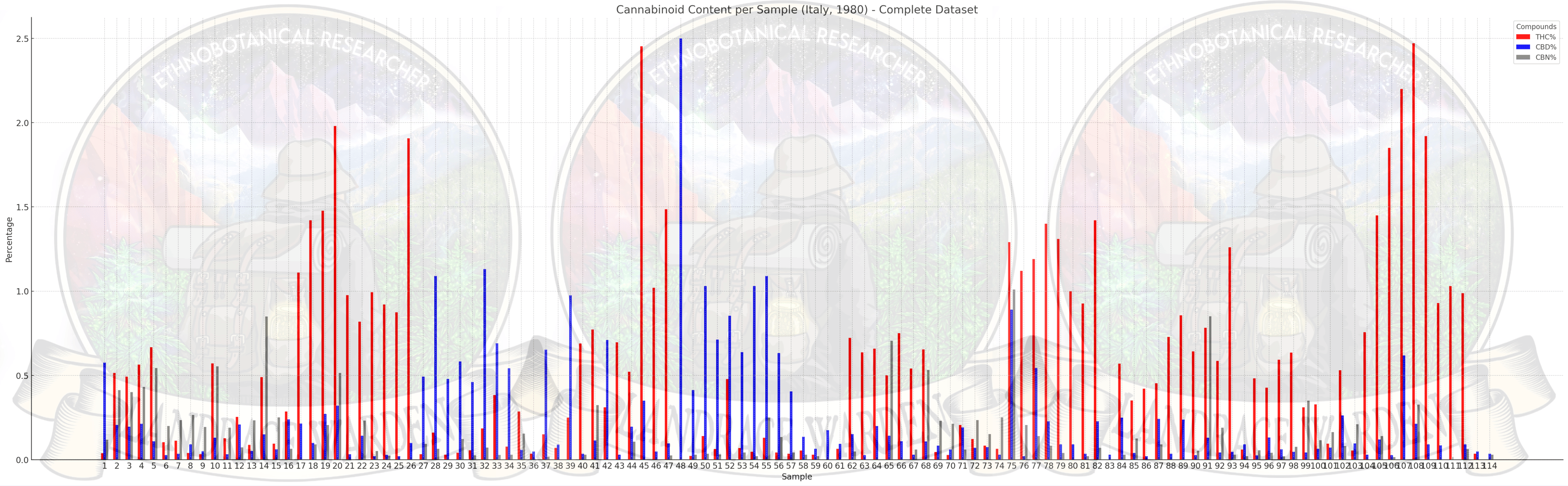 While many voice skepticism that cannabis of that era was so low in THC, the data shows much of it was. However, a higher resolution discussion would be focused on changes in ratios, ratios of THC to other trace cannabinoids besides CBD, terpene ratios, and total terpene content to THC ratio. The point is, a traditional Italian hemp fibre variety in the 1990’s contained as much THC in some phenotypes as was common for ‘illegal consumption’ in the region less than 20 years prior.