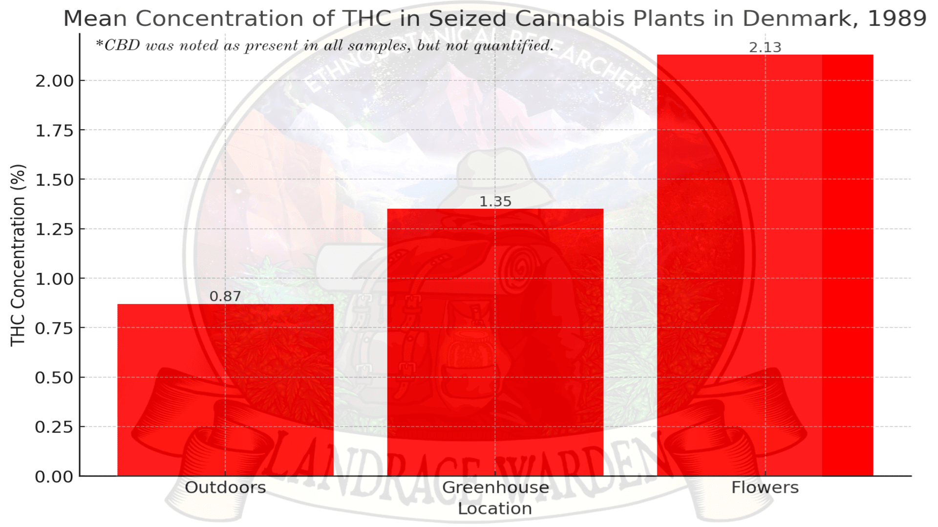 Those results weren’t a one off either. In 1989, 449 cannabis plants and 26 ‘fruiting tops’ were analysed in Denmark. The average potency of outdoor grown plants was 0.87% THC, and for