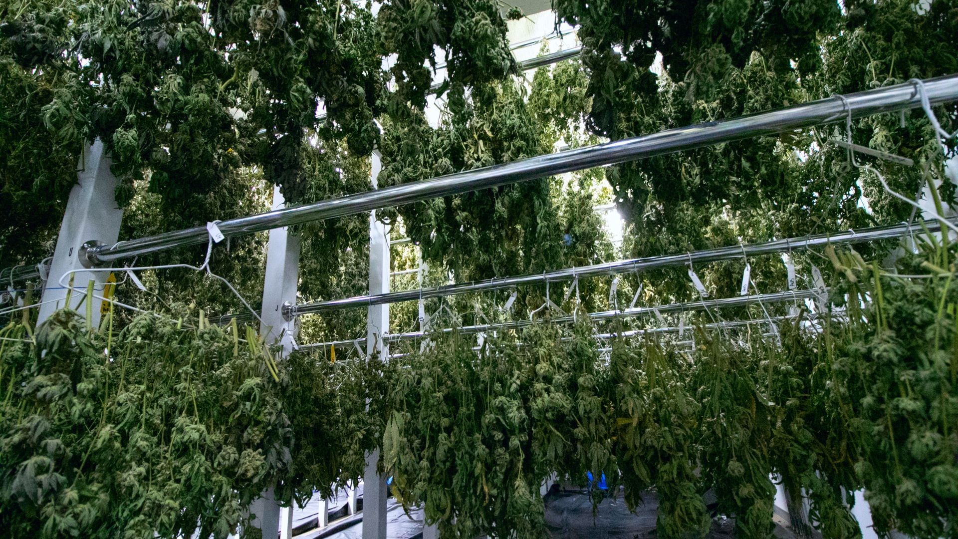 If you are drying in your grow room, you can attach a metal wire that can be cut to specifications from your local hardware store with J hooks or eye hooks. Just make sure you attach it to the wooden studs to support the weight of your harvest. You can leave this wire hanging throughout the grow and attach additional Kola supports like these yo-yos.