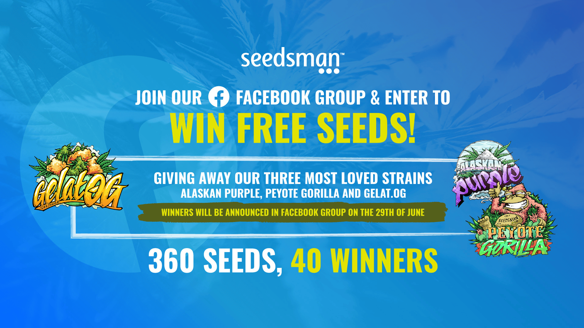We're giving away 360 seeds of our three most loved strains: Alaskan Purple. Peyote Gorilla and Gelat.OG to 40 winners!