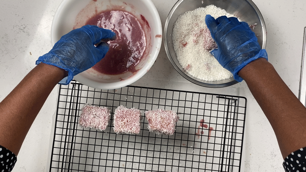 • Le Lamington est difficile à préparer à l'étape du "trempage et du roulage", il est donc conseillé de répartir les 200 g de noix de coco déshydratée dans deux bols de taille moyenne.